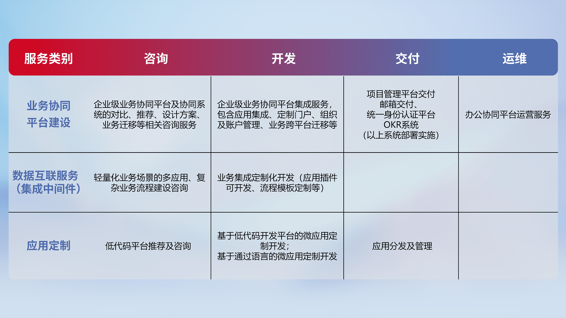 针对钉钉、、、、企微、、IDaas等平台级产品提供产品的规划、、、方案、、、交付、、定制化开发等服务,,,,实现如统一协同办公、、、、智能客户服务、、混合会议管理、、智能数据查询、、、、等业务场景,,,实现数字化转型。。。